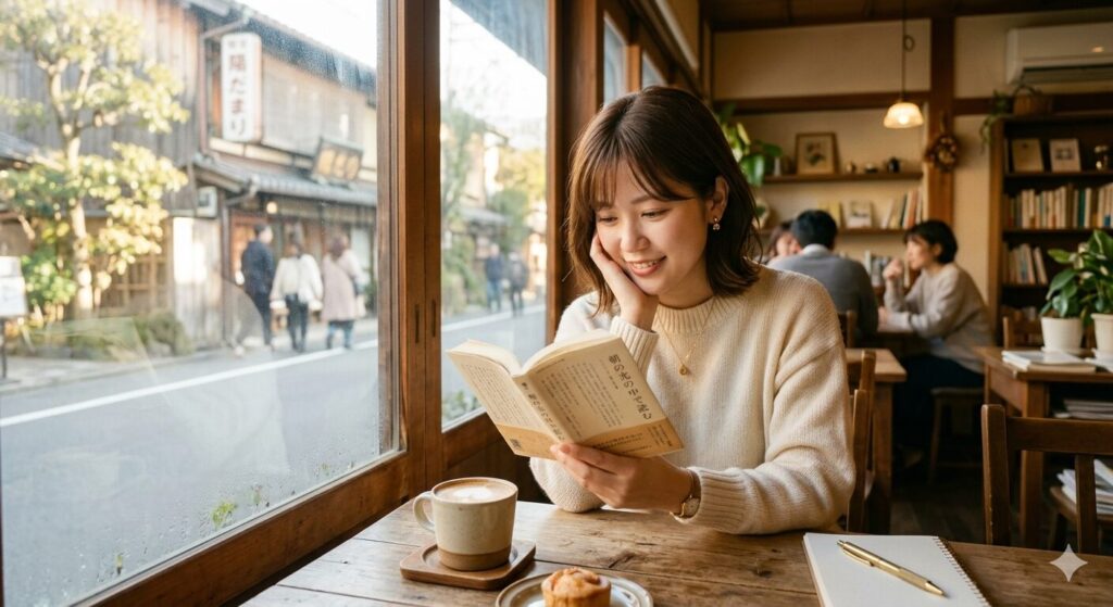 例:「カフェで読書をする若い女性、窓から差し込む朝の光、温かみのある雰囲気の写真風画像を作って」